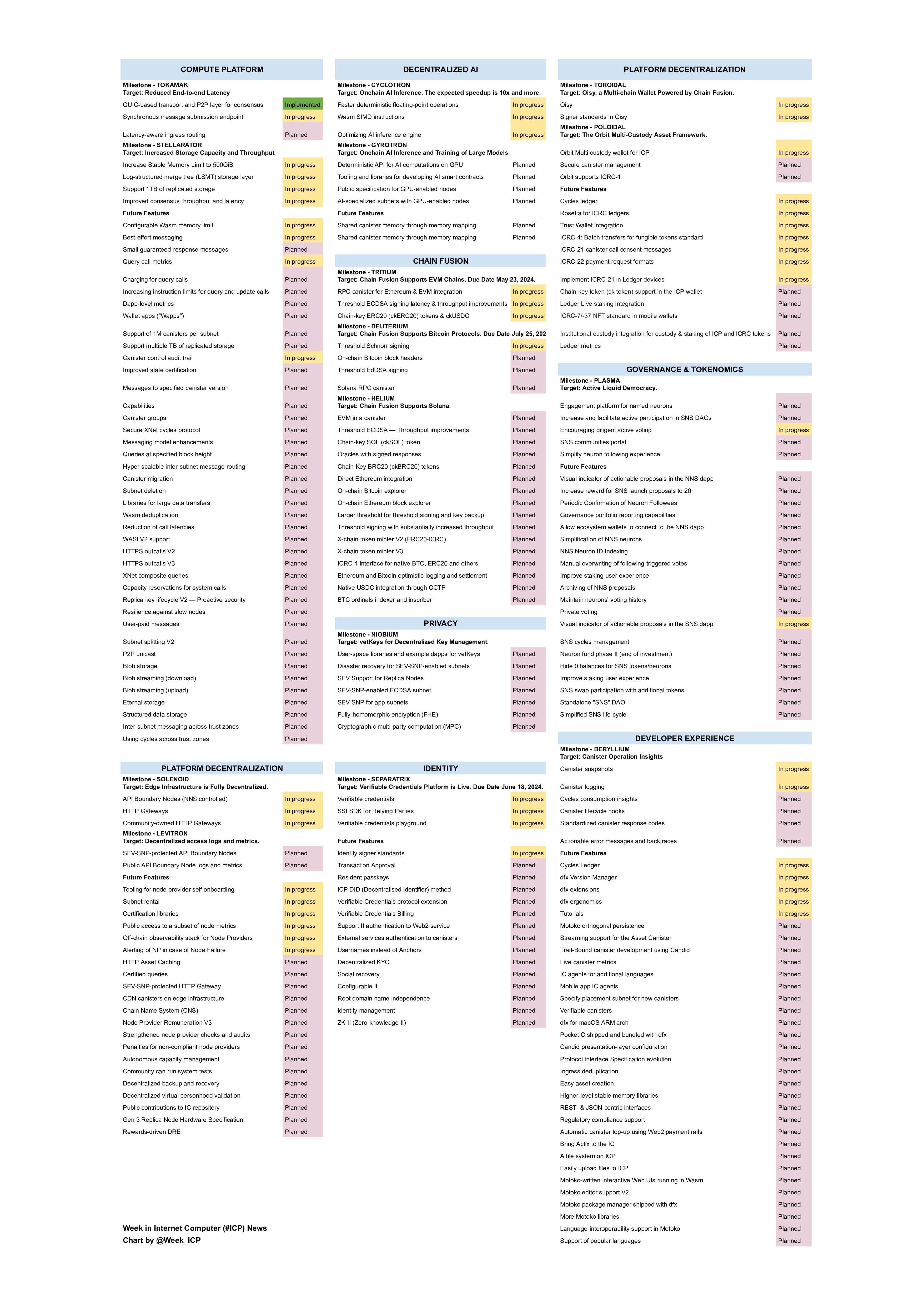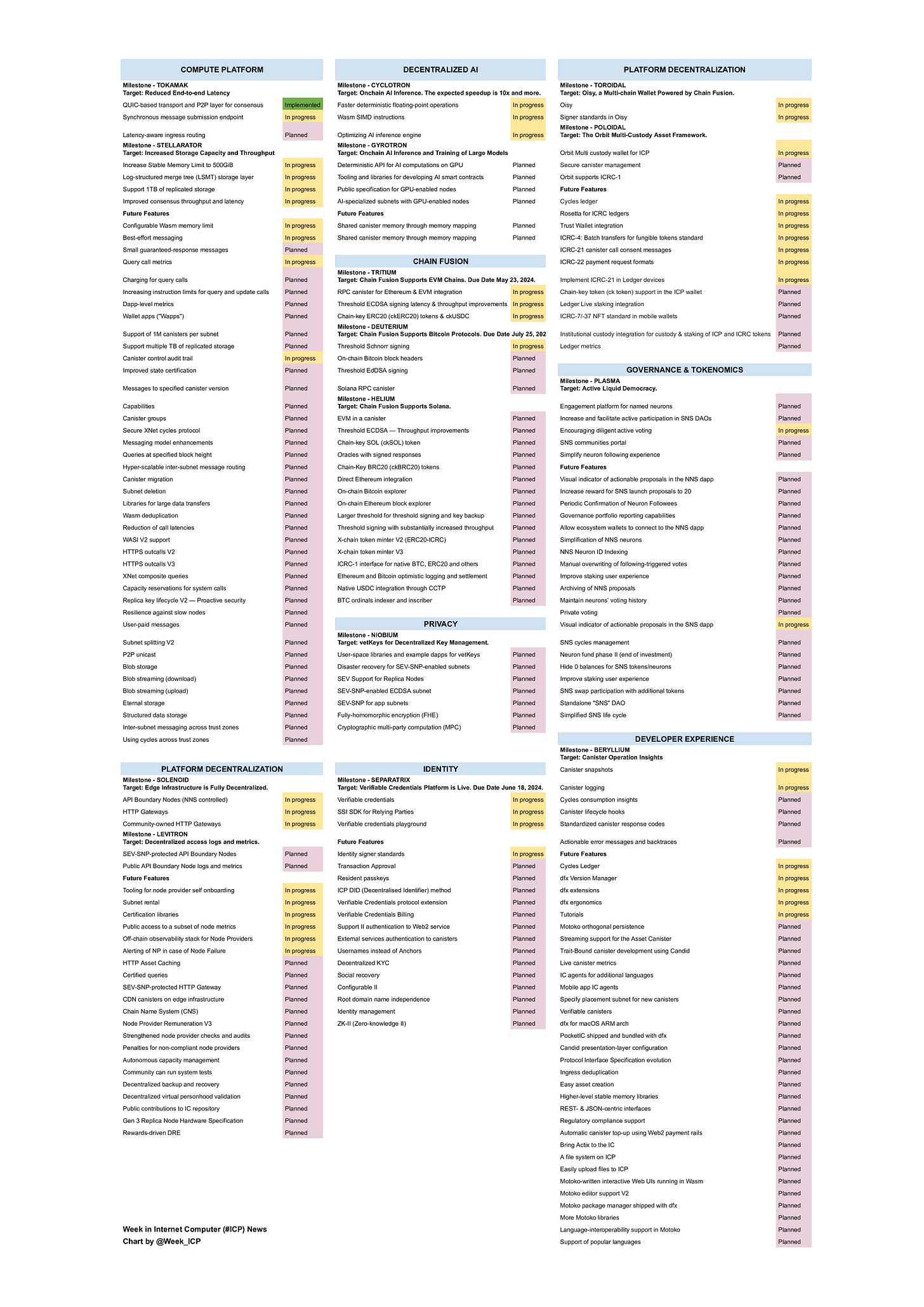 The roadmap consists of nine core themes: Computer Platform, Decentralized AI, Chain Fusion, Privacy, Platform Decentralization, Identity, Digital Assets, Governance & Tokenomics, and Developer Experience.